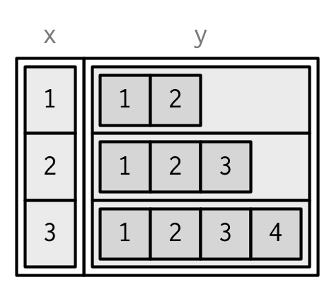 It’s also possible to have a column of a data frame that’s a matrix or array, as long as the number of rows matches the data frame. (This requires a slight extension to our definition of a data frame: it’s not the length() of each column that must be equal; but the NROW().) Like with list-columns, you must either add after creation, or wrap in I().