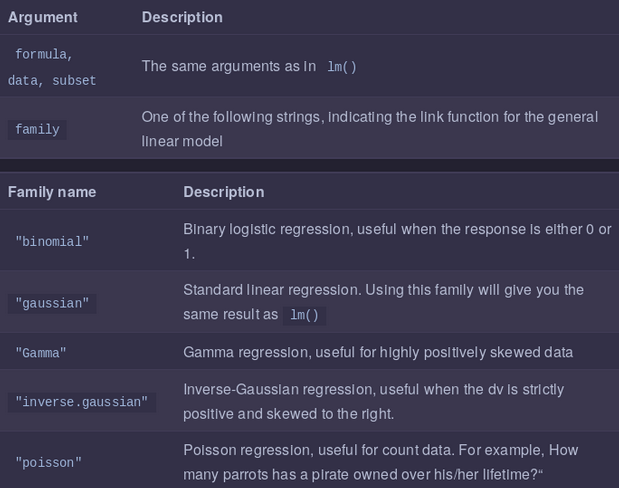 The GLM is a more general class of linear models that change the distribution of your dependent variable. In other words, it allows you to use the linear model even when your dependent variable isn’t a normal bell-shape. Here are 4 of the most common distributions you can can model with glm():